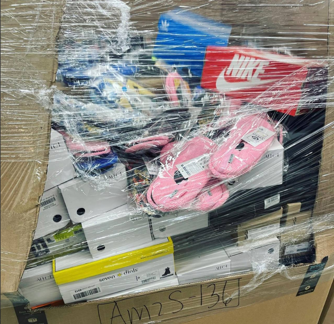 - Pallet contains shoes of different colors and sizes